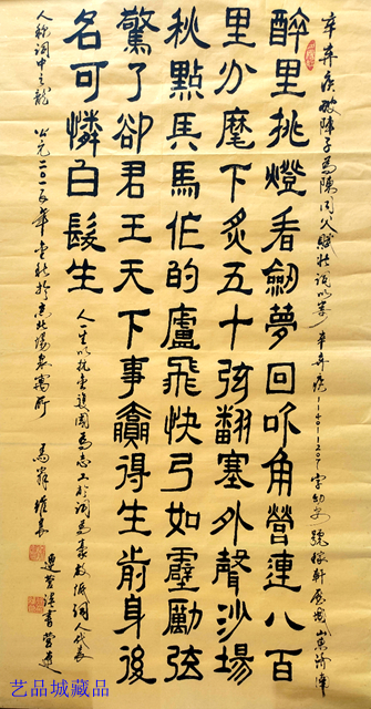 徐维良先生长期致力于书法艺术的探索与创新,在篆书领域造诣深厚。篆书作为汉字古代书体之一,具有悠久的历史和独特的艺术价值,其线条婉转、结构规整,蕴含着古朴典雅之美。徐维良先生选择以篆书书写辛弃疾的《破阵子》,旨在通过这种庄重、沉稳的书体,深入挖掘词作的精神内涵,赋予经典以新的艺术生命力。