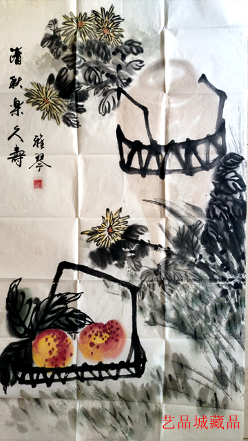如作品《清秋寿》,以菊花与寿桃为核心题材,菊花象征高洁不屈,寿桃寓意健康长寿,二者结合传递出 “清雅长寿” 的美好祈愿,契合大众对吉祥文化的心理需求。